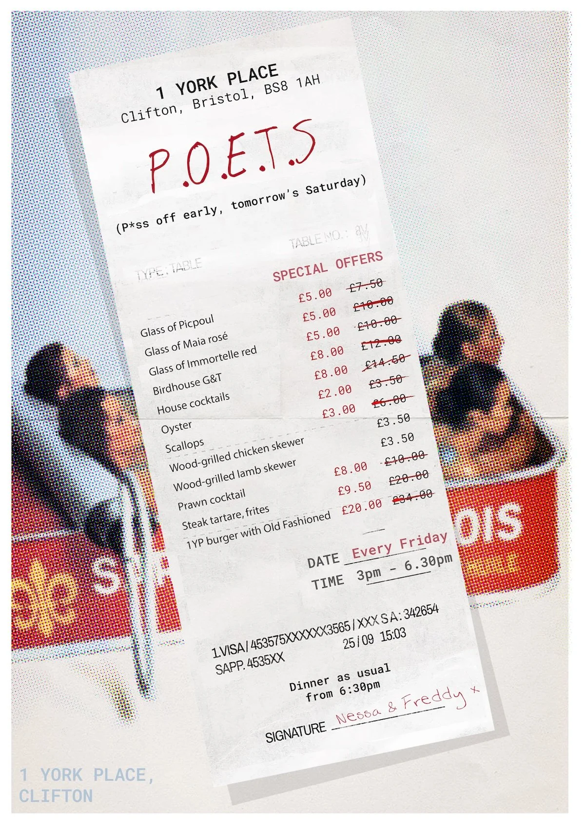 If you’re feeling a little peckish after a long day at work, ease into the weekend with some delicious bites: £2 oysters, £3 scallops, or some of our 1 York Place favourites like our steak tartare and frites, with special prices just for POETS. Check out the menu in the image above or find it here.